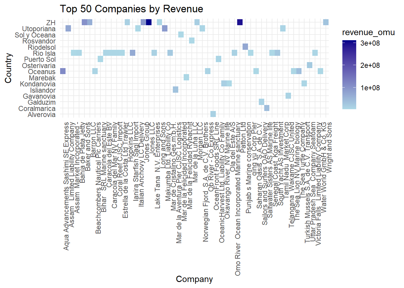slice_max(order_by = revenue_omu, n = 50)When we look at the heatmap, we can see that the y-axis comprises of the various countries the companies are from, and the x-axis are the different companies. The different shades of blue indicate the varying revenue, from $3,652 up till $310.6million - such a wide range!