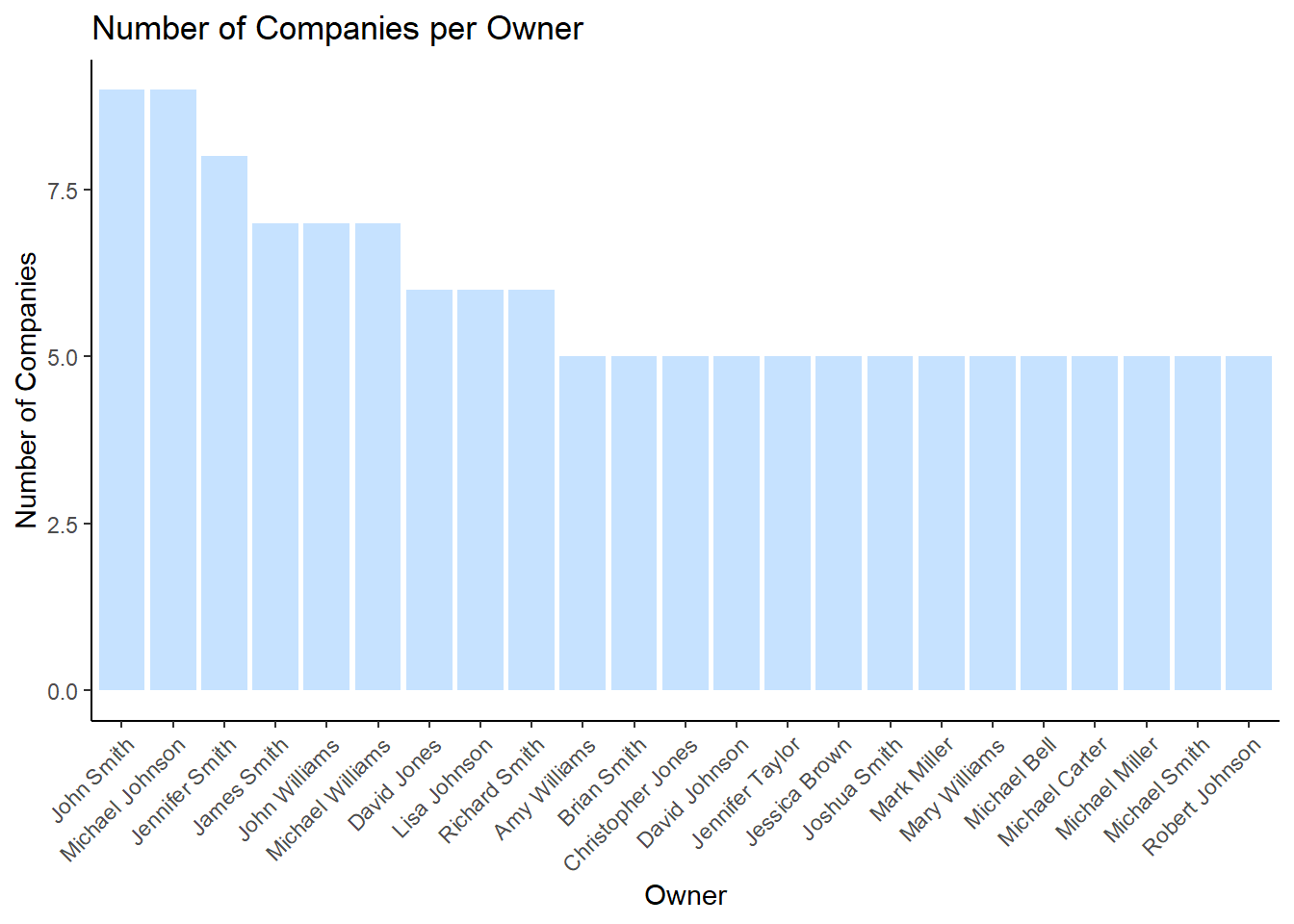 Looking at the barchart, we can see that there are 14 owners who own 5 companies, and 9 owners who own MORE THAN 5 companies. In fact, 2 of them - John Smith and Michael Johnson - own 9 companies each, and Jennifer Smith owns 8 companies. I think this is definitely an anomaly which should be taken into consideration for further investigation by the relevant authorities.