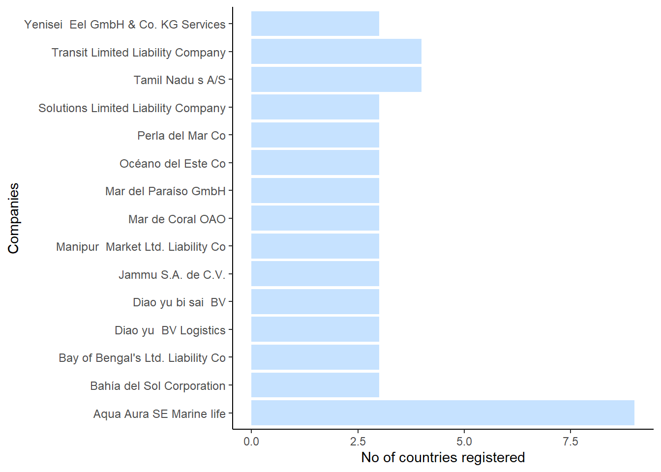 We can see from the barchart that Aqua Aura SE Marine Life is registered in a whopping 9 companies! Next would be Transit Limited Liability Company and Tamil Nadu, which are registered in 4 countries. It would be beneficial to flag these 3 countries as an anomaly.